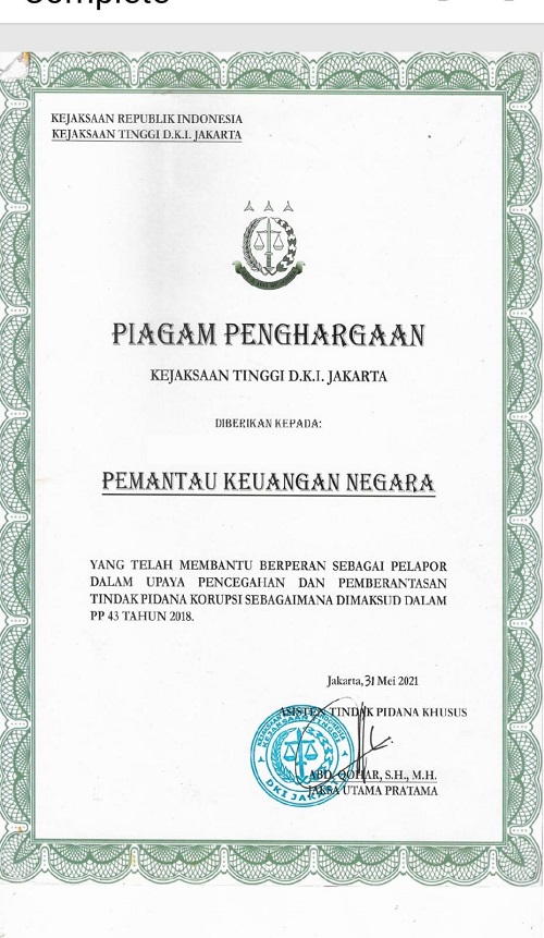 Prestasi ini selaras dengan Undang-Undang Nomor 31 Tahun 1999 tentang Pemberantasan Tindak Pidana Korupsi serta PP Nomor 43 Tahun 2018 tentang Peran Serta Masyarakat dalam Pemberantasan Korupsi.