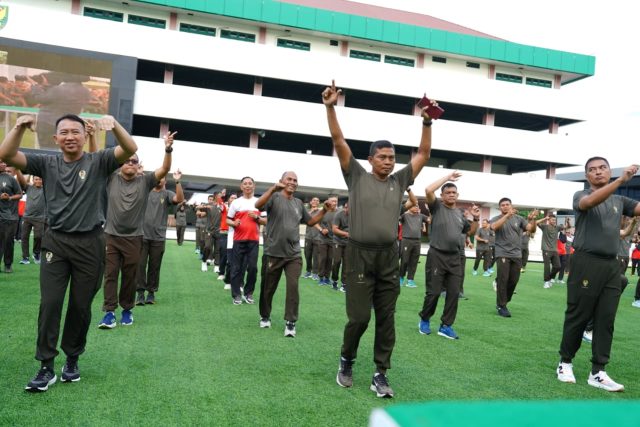 Sumsel, expose – Panglima Kodam II/Sriwijaya Mayjen TNI Ujang Darwis, M.D.A., dan PJU Kodam II/Swj bersama Para Prajurit dan PNS Makodam II/Swj melaksanakan olahraga bersama bertempat di Lapangan Apel Makodam II/Sriwijaya, Jum’at (12/09/2025).