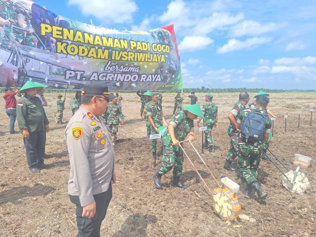 Banyuasin, Expose – Guna mendorong ketahanan pangan di wilayah Sumatera Selatan, Panglima Kodam II/Sriwijaya memimpin secara langsung kegiatan penanaman padi gogo secara simbolis di lahan PT Agrindo Raya, Desa Pematang Palas, Kecamatan Banyuasin I, Kamis (18/9/2025). Kegiatan yang melibatkan sejumlah pejabat teras militer, pemerintah daerah, dan masyarakat ini berlangsung aman dan lancar berkat pengamanan yang disiapkan oleh Polsek Mariana.