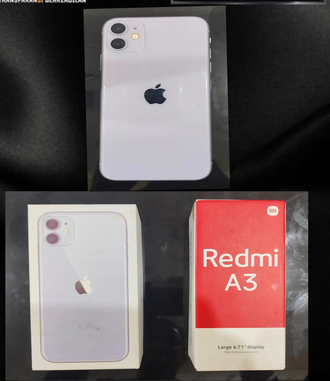 Dari tangan tersangka, polisi berhasil mengamankan satu unit handphone iPhone 11 warna ungu beserta kotaknya, dan satu buah kotak handphone Redmi A3. Dua unit handphone lainnya diduga telah dilepas oleh tersangka.