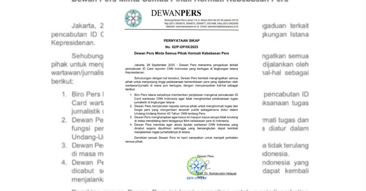 Dewan Pers melalui pernyataan sikap resmi bernomor 02/P-DP/IX/2025 menegaskan agar semua pihak menghormati kebebasan pers sebagaimana diamanatkan Undang-Undang Nomor 40 Tahun 1999 tentang Pers.