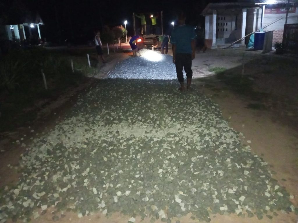 Kepala desa setempat, Munip Ispandik. menerangkan untuk mempercepat proses pengerjaan, pengoralan langsung diaplikasikan saat material tiba di lokasi pada malam hari, hal tersebut mengingat padatnya aktivitas warga yang saat ini sudah memasuki musim turun ke sawah untuk bercocok tanam, Munip Ispandik menyebutkan apabila sudah kerjakan ketika material masuk tentunya akan mempercepat proses penyelesaian pekerjaan ini di keesokan harinya.
