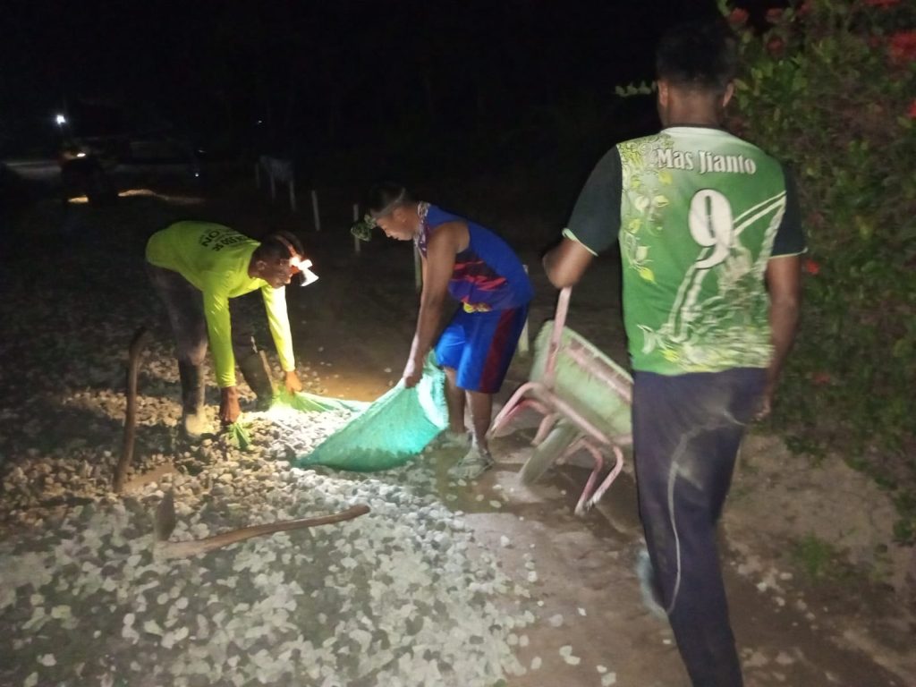 Banyuasin, Expose – Kejar target penyelesaian pembangunan fisik anggaran dana desa tahun 2025, pemerintah desa tirta jaya, kecamatan muara padang, kabupaten banyuasin sumatera selatan, realisasikan pengerasan jalan desa dengan pengamparan koral, giat tersebut terpantau dikerjakan secara swakelola oleh warga masyarakat setempat, kamis malam. 3 Oktober 2025.
