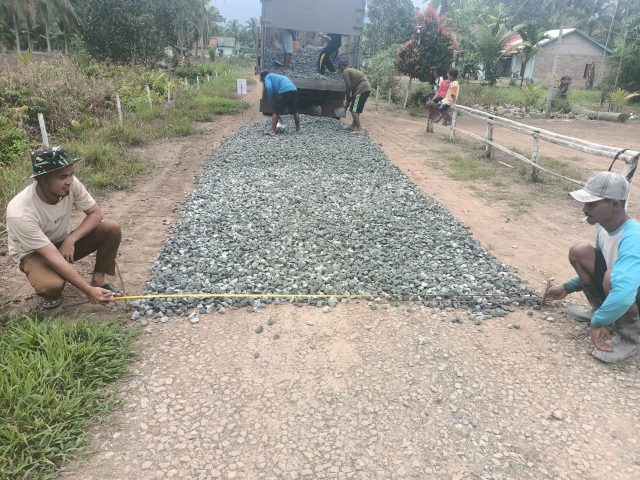 Proses pengerjaan pengoralan ini juga diketahui di aplikasikan di wilayah dusun satu (01) dengan volume sepanjang empat ratus enam puluh meter (460m) dengan lebar dua setengah meter (2,5 m) serta tebal sepuluh centi meter (10,cm), menggunakan anggaran dana desa tahun 2025 tahap ke dua sebesar Rp,130,000,000 (seratus tiga puluh juta rupiah).