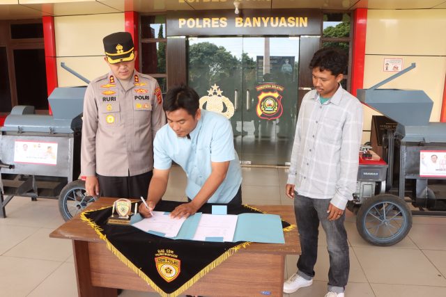Banyuasin, Expose – Guna mendukung ketahanan pangan dan meningkatkan produktivitas petani, Polres Banyuasin menyalurkan bantuan mesin pemipil jagung dari Kapolri kepada dua kelompok tani di Kabupaten Banyuasin. Penyerahan bantuan ini berlangsung di Mapolres Banyuasin, Jumat (3/10/2025).
