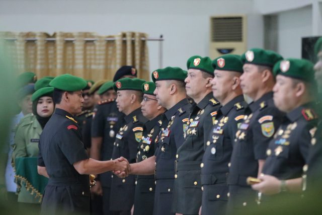 Palembang, Expose – Panglima Kodam II/Sriwijaya, Mayjen TNI Ujang Darwis, M.D.A., memimpin langsung upacara Serah Terima Jabatan (Sertijab) lima pejabat di jajaran Kodam II/Sriwijaya yang digelar di Gedung Sudirman, Makodam II/Sriwijaya, Palembang, Rabu (8/10/2025).