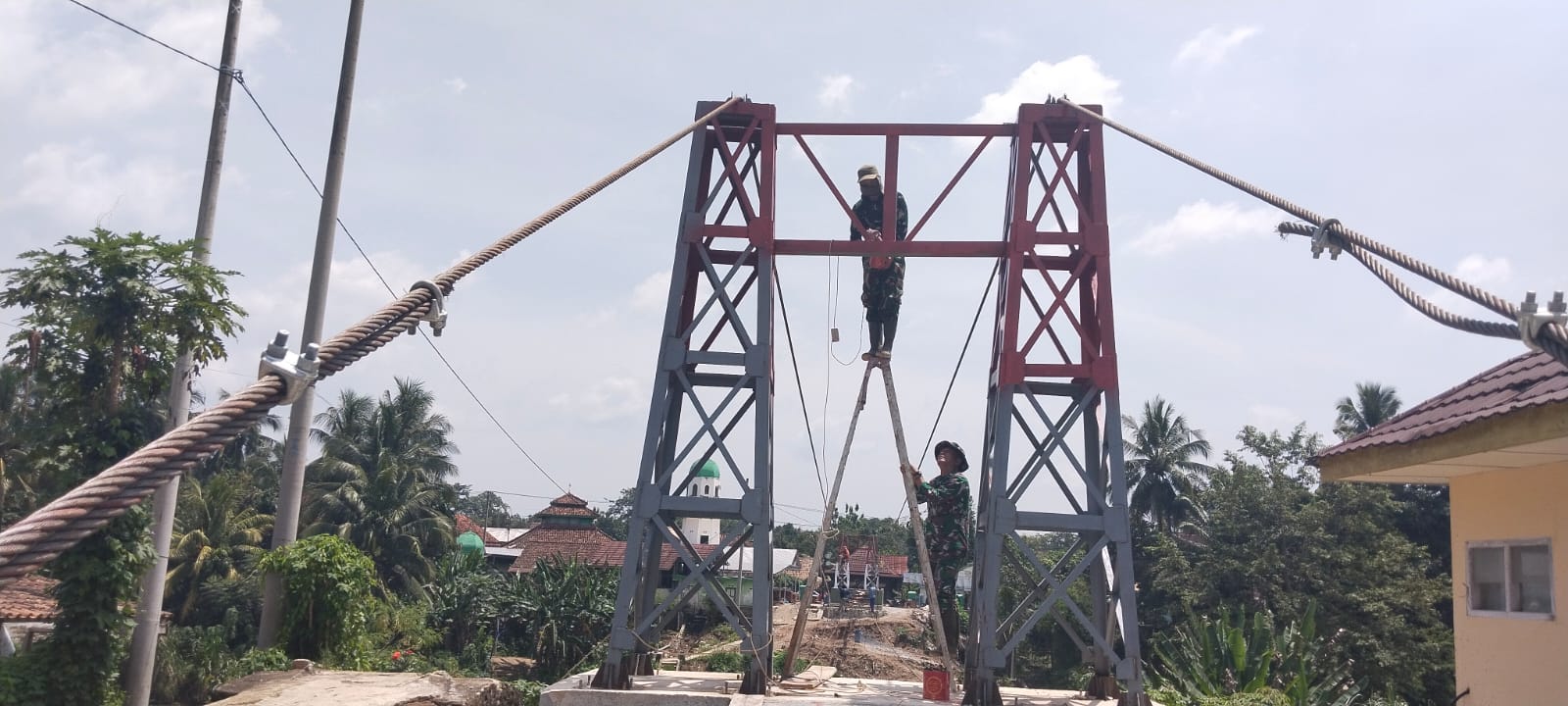 Pembangunan jembatan gantung pertama berada di wilayah Kabupaten Ogan Komering Ulu (OKU), yakni berlokasi di Desa Pusar, Kec. Baturaja Barat, Kab. Ogan Komering Ulu, Prov. Sumsel, masuk wilayah Koramil 403-12/Baturaja Kodim 0403/OKU. Jembatan gantung ini memiliki panjang 100 meter dengan lebar 2 meter yang membentang di Sungai Ogan. Proses pembangunan infrastruktur itu dilakukan oleh prajurit TNI AD dan dibantu warga setempat.