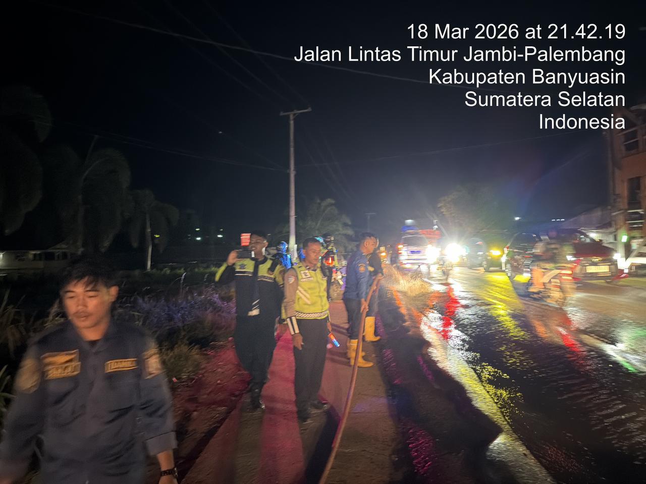 Kegiatan ini dipimpin langsung oleh Kabag Ops Polres Banyuasin, Kompol Azmi Halim Permana, SIK, MAP. Beliau turun ke lokasi bersama Tim Patroli Perintis Presisi (Beat) Polres Banyuasin serta Kapolsek Betung. Langkah cepat ini diambil setelah menerima laporan bahwa tumpahan solar membuat badan jalan menjadi licin dan berpotensi tinggi menyebabkan kecelakaan lalu lintas, khususnya bagi kendaraan roda dua yang melintas di malam hari.